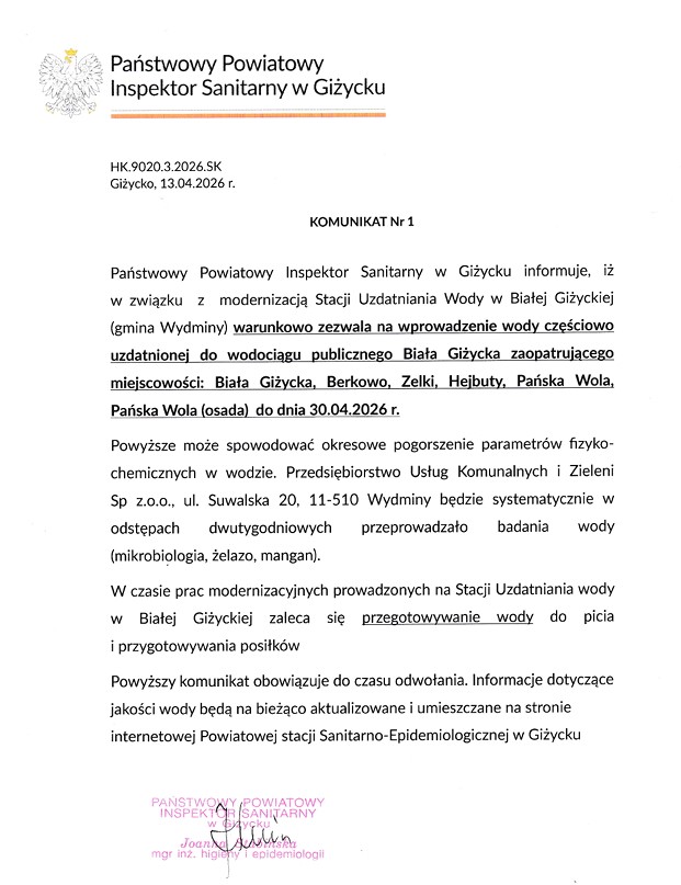 Informujemy, że w związku z prowadzoną modernizacją sieci wodociągowej w miejscowości Biała Giżycka, planowane jest wykonanie przepięcia przyłączy wodociągowych.